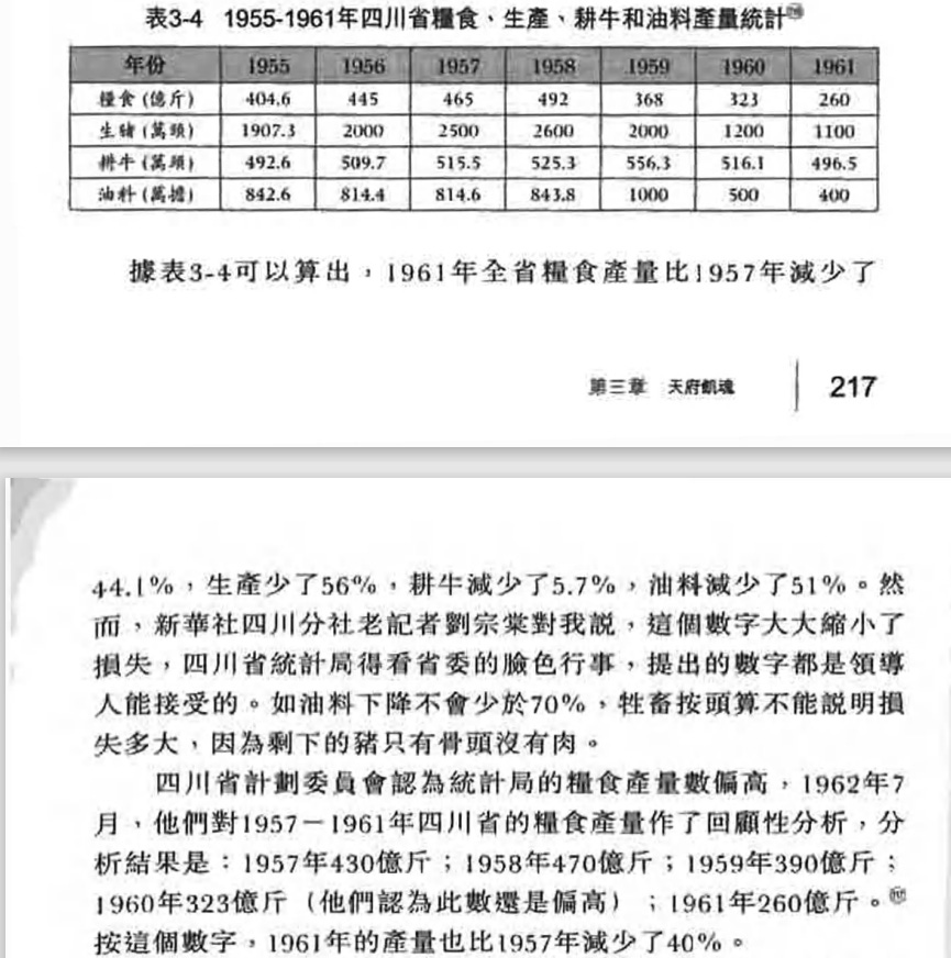 >p183 四川省歷來就是調出糧食多的省份。…… 1958年開始連續三年大減產,而糧食外調任務卻連年增加。…… 爲甚麽中央領導人一再向四川追加任務?當時中央領導人的解釋是:問題發生在四川,總比發生在京、津、滬地區政治、經濟和各方面的影響要小一些。後來被傳為「寧肯四川餓死人,也不能讓京、津、滬餓死人。」
