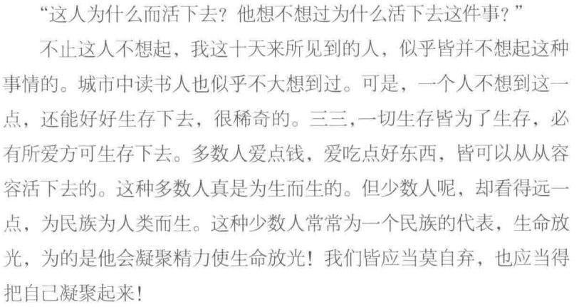 不止这人不想起,我这十天来所见到过的人,似乎皆并不想起这种事情的。城市中读书人也似乎不大想到过。可是,一个人不想到这一点,还能好好生存下去,很稀奇的。三三,一切生存皆为了生存,必有所爱方可生存下去。多数人爱点钱,爱吃点好东西,皆可以从从容容活下去的。这种多数人真是为生而生的。但少数人呢,却看得远一点,为民族为人类而生。这种少数人常常为一个民族的代表,生命放光,为的是他会凝聚精力使生命放光!我们皆应当莫自弃,也应当得把自己凝聚起来!