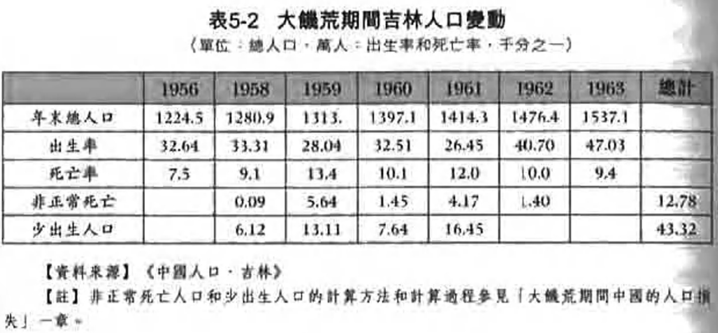 >p319-320 據官方公佈的人口統計資料計算,從1958年到1960年,全省非正常死亡人口有12.78萬人,另有因營養不足少出生人口43.32萬人,詳見表5-2。與有些省份相比,吉林的饑荒顯然要輕得多。