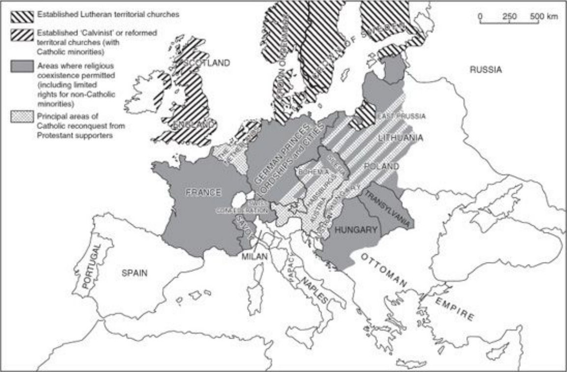 >p61 The religious map of divided Western Christendom was fundamentally decided – in a universal extension of the German principle of cuius regio, eius religio – by the wishes of the powers-that-be.